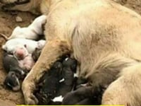 H2003013_Mother dog gives birth to puppies at construct